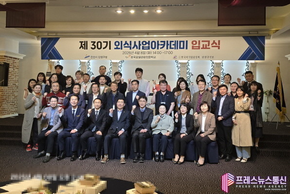 | ▲지난 8일 한국호텔관광실용전문학교 미래관 컨벤션홀에서 열린 2025년 제30기 외식사업 아카데미 입교식에서 참석자들이 기념촬영을 하고 있다.(사진=단원구) |