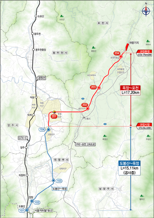 ‘옥정~포천 광역철도사업’은 도봉산~옥정 광역철도 종점부인 양주 고읍지구에서 포천시 군내면을 연결하는 총 연장 17.2km의 철도를 건설하는 것으로, 경기 북동부지역 도민들의 오랜 숙원사업이다.