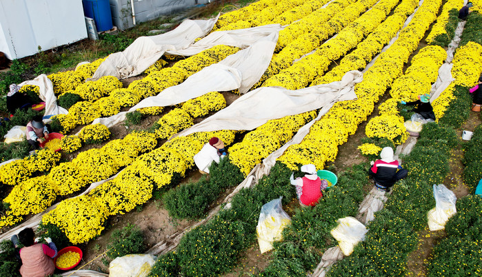 | ▲경남 의령군 칠곡면 신포리 김대현 씨 농가 감국화밭에서 20일 주민들이 국화차와 약용의 원료로 사용하는 황금빛 감국화를 정성스레 따느라 여념이 없다. |