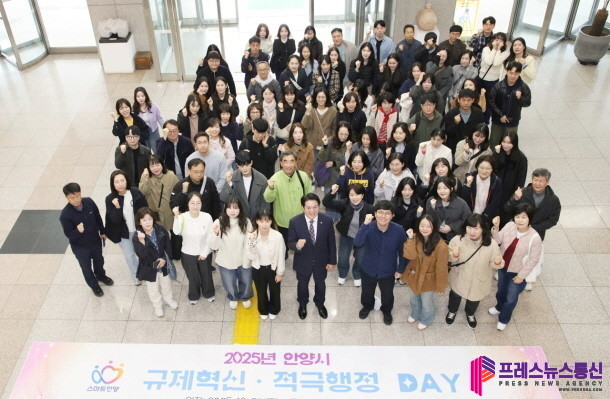 | ▲안양시 공무원들이 규제혁신 적극행정 워크숍 시작에 앞서 시청 본관 로비에서 기념사진을 찍고 있다.(사진=안양시) |