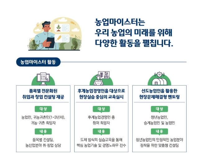 또한 시군의 농업 유관기관, 농업마이스터대학 등에서 농업분야 현장실습 교수, 귀농·귀촌 및 후계농, 청년농 멘토, 영농상담사 등으로 활동할 수 있게 된다.