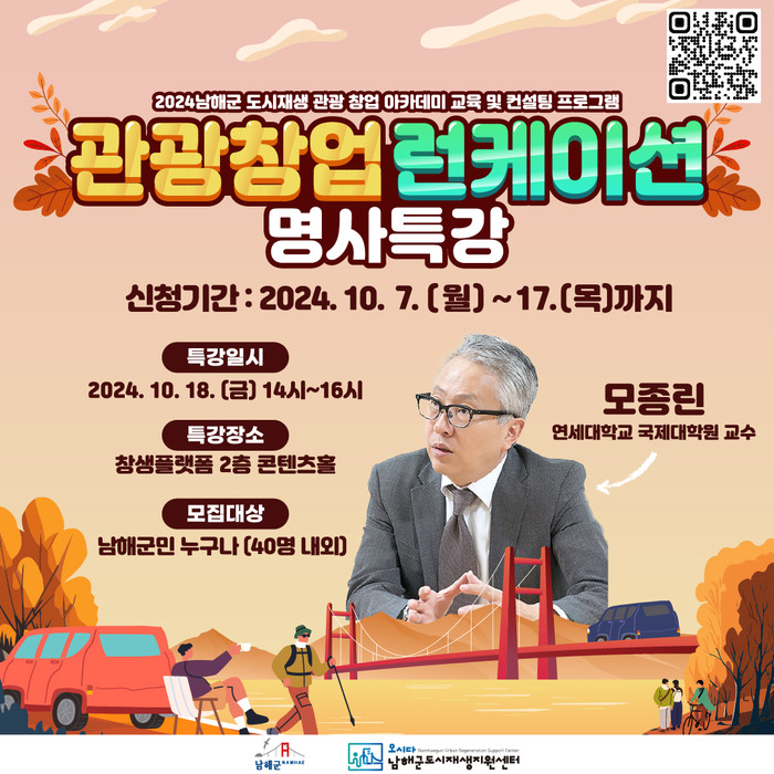 해당 프로그램은 구 장수장 및 여의도 나이트클럽을 신축 및 리모델링한 창생플랫폼(남해읍 화전로78번가길 25-10)에서 진행된다, 특강에 관심 있는 군민 누구나 신청 가능하다. 오는 17일까지 QR코드를 통해 사전 참가신청을 받으며, 특강 당일 창생플랫폼 내 현장접수도 진행할 예정이다.