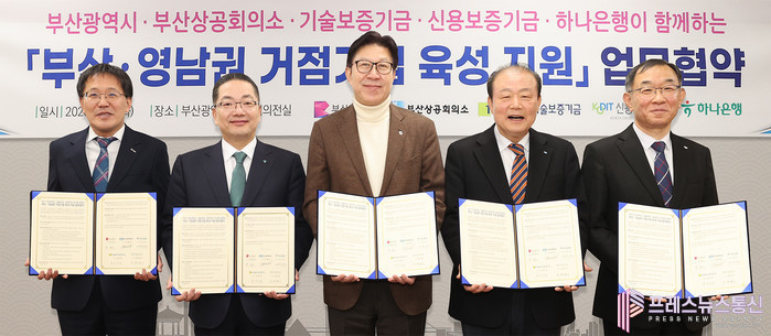 [프레스뉴스] 류현주 기자= 하나은행(은행장 이호성)은 부산광역시(시장 박형준), 부산상공회의소(회장 양재생), 기술보증기금(이사장 김종호) 및 신용보증기금(이사장 최원목)과 함께 「부산ㆍ영남권 거점기업 육성 지원」을 위한 업무협약을 체결했다고 밝혔다.