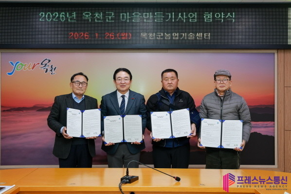 [프레스뉴스] 류현주 기자= 옥천군은 1월 26일 오후 2시, 옥천군농업기술센터 2층 소회의실에서 ‘2026년 옥천군 마을만들기사업 협약식’을 열고 동이면 금암2리, 안남면 도덕1리, 청산면 한곡리 등 3개 마을과 협약을 체결했다.