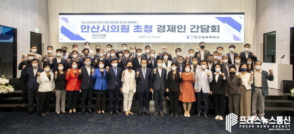 | ▲ 안산시의회 의원들이 지난 14일 안산상공회의소가 주최한 ‘안산시의원 초청 경제인 간담회’에 참석해 지역 경제인들과 기념촬영을 하고 있다.(사진=안산시의회) |