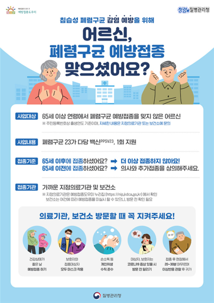 ▶ 65세 이상 어르신 ‘폐렴구균 무료 예방접종’ 챙기세요!