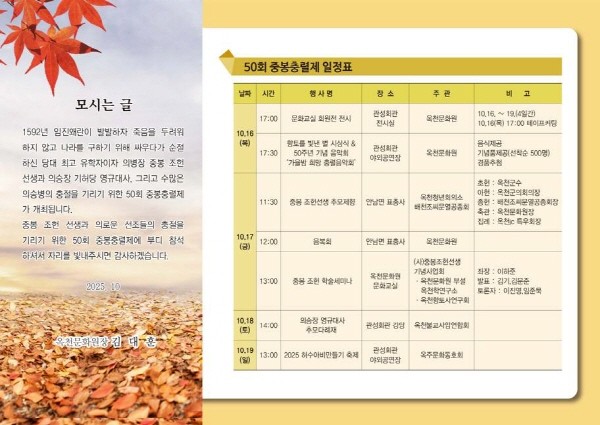 [프레스뉴스] 류현주 기자= 옥천군은 옥천문화원 주최로 10월 16일부터 19일까지 4일간, 안남면 표충사와 관성회관 일원에서 ‘제50회 중봉충렬제’를 개최한다.
