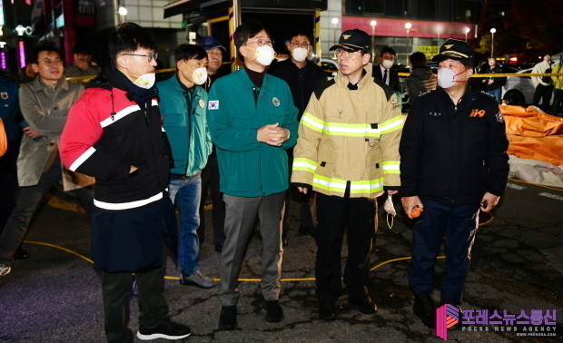 | ▲이민근 안산시장이 17일 단원구 중앙동 상가 화재 현장을 긴급 점검하고 사고 수습 및 2차 피해 방지를 위해 주변 안전진단을 지시하고 있다.(사진=안산시) |