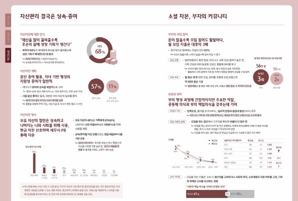 부자의 83%는 정기적 모임에 참여한다. 자산이 많을수록, 소득이 높을수록 참여하는 모임이 많다. 모임의 절대적 가치는 ‘친목 도모ㆍ즐거움’이지만 자산운용에도 직간접적 영향을 미친다. 모임 참여자는 ETF에 더 많은 자산을 배분(미참여자의 1.5배)하고 연금자산도 더 많이 확보한 반면, 모임 미참여자는 예금 등 현금성 자산에 더 많은 돈을 예치(참여자의 1.4배)해 금융 수익 측면에서 모임 참여자가 더 유리할 수 있음을 보여준다.