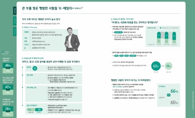 황선경 하나금융연구소 연구위원은 “K-EMILLI는 과거 사업 성공이나 상속에 의존하던 방식에서 벗어나 자신만의 관점으로 적극적인 금융 투자를 통해 부를 축적하고 있는 새로운 부자 유형이다”며, “이들은 사회의 주요 경제 주체로서 부의 개념을 바꾸고 기존과 다른 부의 형성 방식을 선도한다는 점에서 더욱 의미가 깊다”고 밝혔다.