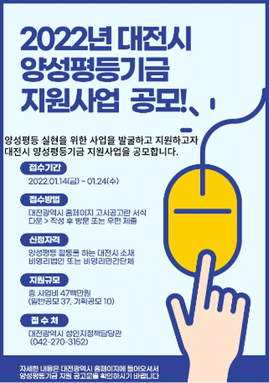 [프레스뉴스] 장현준 기자= 대전시는 양성평등 촉진과 여성의 권익 증진을 위한‘2022년도 양성평등기금 지원 사업’을 공모한다고 밝혔다.