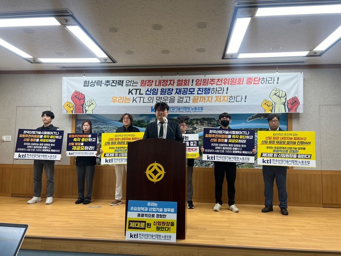 유동훈 노조 위원장은 “최근 진행 된 신임원장 임명을 위한 임원추천위원회 결과 KTL 주무처인 산업통상자원부 출신은 단 한명도 없고, 기관의 임원급도 아닌 본부장급 직원이 차기원장으로 하마평에 오르고 있다”고 밝히며 “신임원장 임명에 있어 대내외 위기상황과 부당함에 당당히 맞설 수 있는 추진력과 협상력을 갖춘 원장이 필요하다”고 말했다.