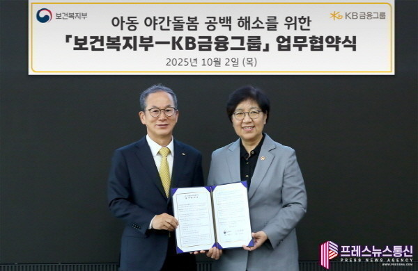 [프레스뉴스] 류현주 기자= KB금융그룹(회장 양종희)이 2일, 여의도 KB국민은행 신관에서 정은경 보건복지부 장관과 양종희 KB금융그룹 회장이 참석한 가운데, 보건복지부와 ‘아동 야간 돌봄 공백 해소를 위한 업무협약(MOU)’을 체결했다.