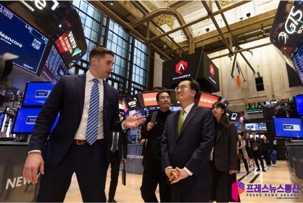 | ▲지난 10월 18일 오전(현지시간) 김동연 경기도지사가 뉴욕 증권거래소를 방문하여 크리스테일러 뉴욕증권거래소 부사장과 대담하고있다.(사진=경기도) |