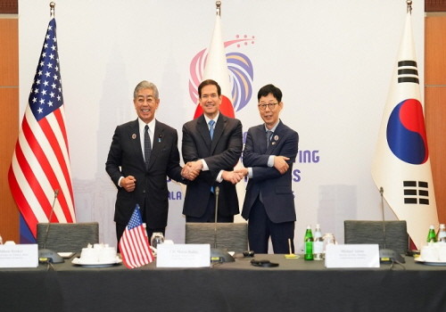 동남아시아국가연합(ASEAN) 관련 외교장관회의 참석 계기로 열린 이번 회의에는 박윤주 외교부 1차관과 마르코 루비오 미국 국무장관, 이와야 다케시 일본 외무대신이 참석했다. 박 차관은 회의에 앞서 최근 미국 텍사스 홍수 피해에 대해 위로를 전했다.