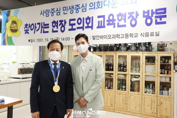 ▲ 경기도의회 장현국 의장, 경기지역 유도.펜싱 학생선수 격려 찾아가는 현장도의회 실시-펜싱 국가대표 김준호 선수와(사진=경기도의회) |