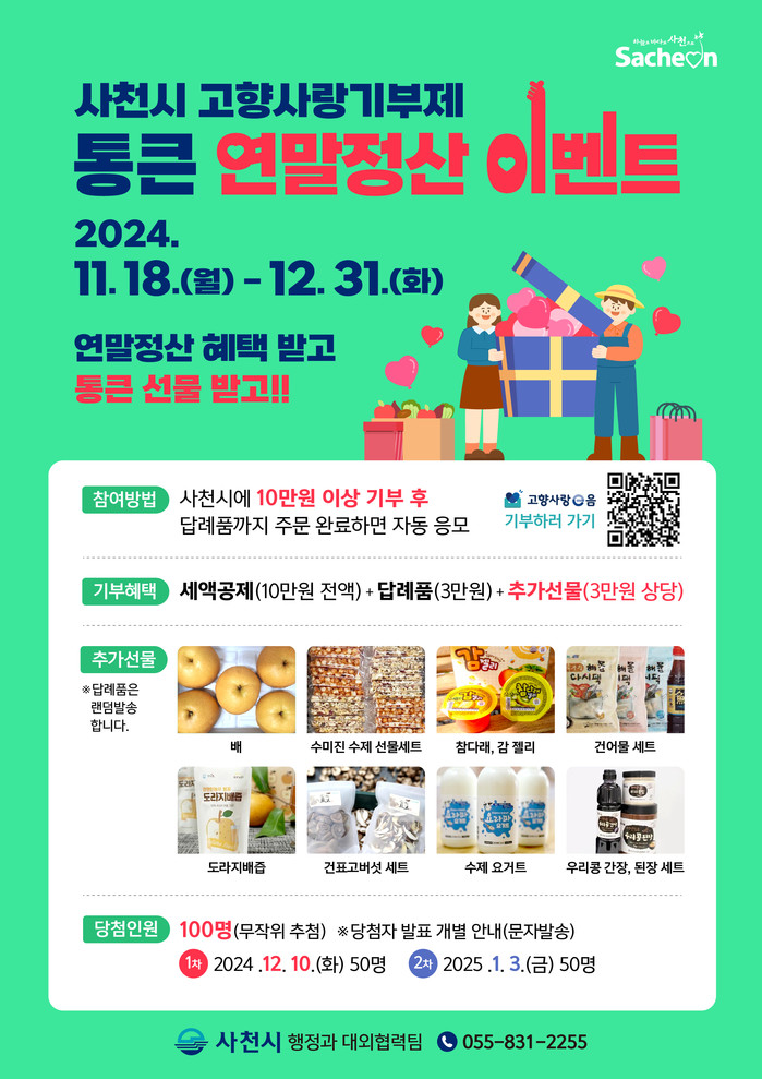 이번 이벤트는 오는 12월 31일까지 사천시에 10만 원이상 기부하고 답례품주문을 완료한 기부자를 대상으로 100명을 추첨해 3만원 상당의 사천시 인기답례품을 추가 제공한다.