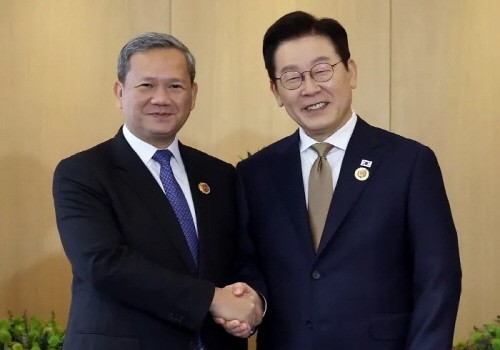 | ▲이재명 대통령과 훈 마네트 캄보디아 총리가 27일(현지시간) 말레이시아 쿠알라룸푸르 한 호텔에서 열린 한·캄보디아 정상회담에 앞서 악수하고 있다.(사진=대통령실사진기자단) |
