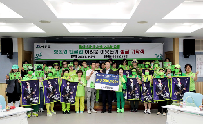 팬클럽 관계자는 “정동원길 선포 3주년을 맞아 가수 정동원과 정동원의 고향 하동을 응원하는 마음을 담아 이웃돕기 성금을 기탁하게 됐다”며 “어려운 이웃에 정동원 가수의 따뜻한 마음이 조금이나마 전해졌으면 좋겠다”고 말했다.