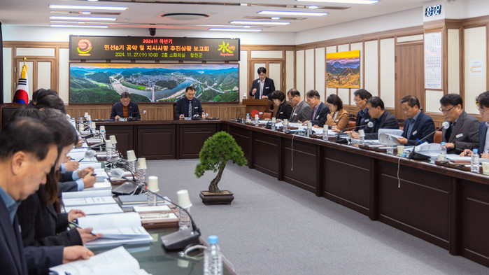 | ▲합천군은 지난 27일 군청 소회의실에서 김윤철 군수 주재로 2024년 하반기 민선8기 공약사업 및 지시사항 추진상황 보고회를 개최했다. (사진=합천군) |