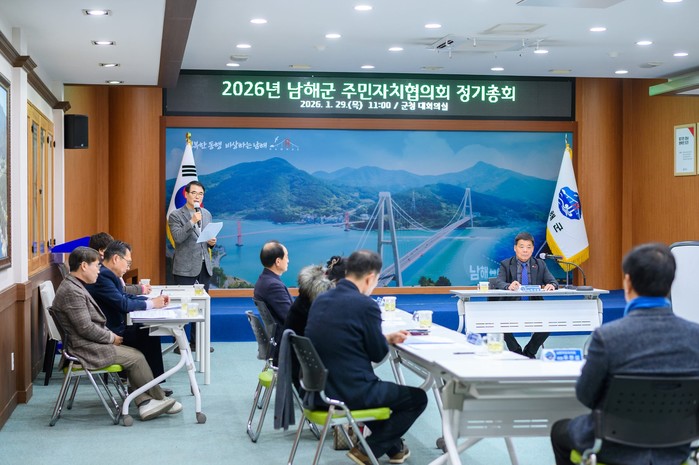 | ▲제3기 남해군 주민자치협의회가 29일 남해군청 대회의실에서 2026년 정기총회를 열었다. (사진=남해군) |