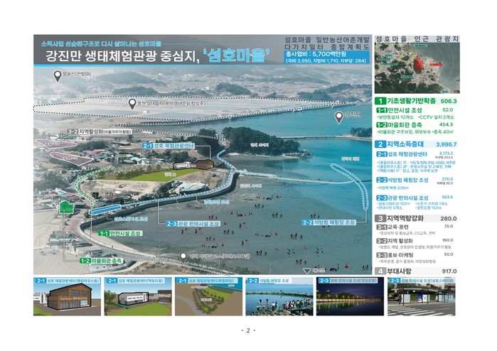 ‘섬호권역 다(多)가치 일터 조성사업’은 2024년부터 5년간 ‘강진만 생태체험 관광 중심지, 섬호마을’이라는 비전으로 추진될 계획이다. 강진만 갯벌의 생산물과 체험을 활용한 소득사업 선순환구조로 ‘다시 살아나는 마을’ 기반을 구축할 예정이다.