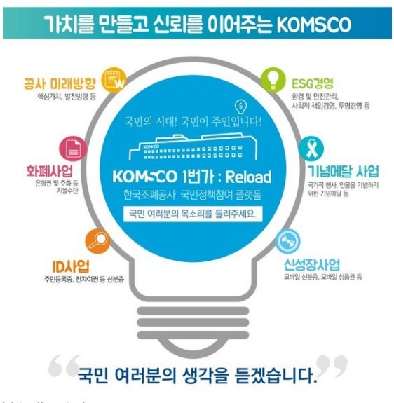 ‘KOMSCO 1번가 : Reload’는 미래 경영방향, 화폐·ID·카드 사업, 특수압인·공공서비스 사업, ESG(환경‧사회‧지배구조) 경영활동 등 4개 분야에 대해 국민들의 의견을 직접 듣는 국민 참여형 플랫폼이다.