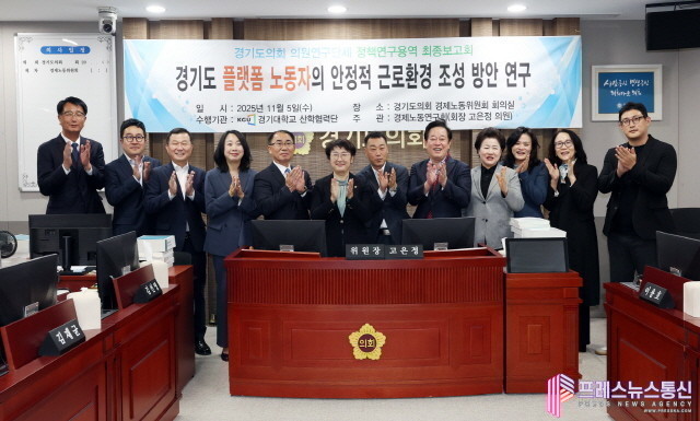 [프레스뉴스] 류현주 기자= 경기도의회 경제노동연구회(회장 고은정 의원)는 지난 5일(수), 경기도의회 경제노동위원회 회의장에서 「경기도 플랫폼 노동자의 안정적 근로환경 조성 방안 연구-도내 플랫폼 노동자 지원 정책 분석을 중심으로」(수탁기관: 경기대학교 산학협력단)에 대한 정책연구용역 최종보고회를 개최하였다.