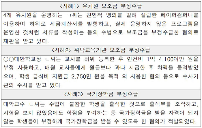 ▲교육분야 정부지원금 부정수급 주요 사례. |