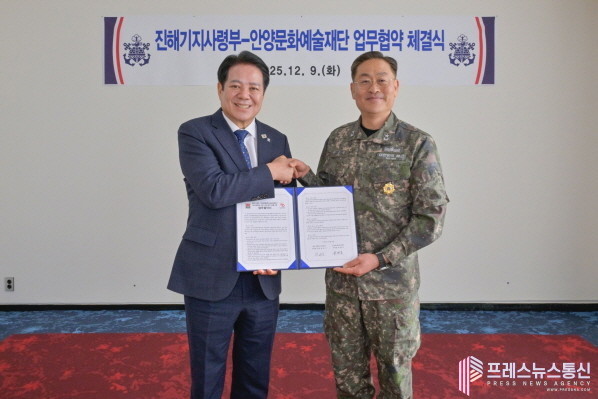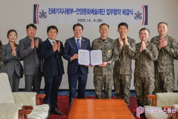[프레스뉴스] 장현준 기자= 안양문화예술재단(이사장 최대호)은 9일 오전 10시 해군 진해기지사령부(사령관 준장 한승우)와 근현대 군사 건축유산의 조사·보존 및 연구 기반 마련을 위한 업무협약(MOU)을 체결했다.