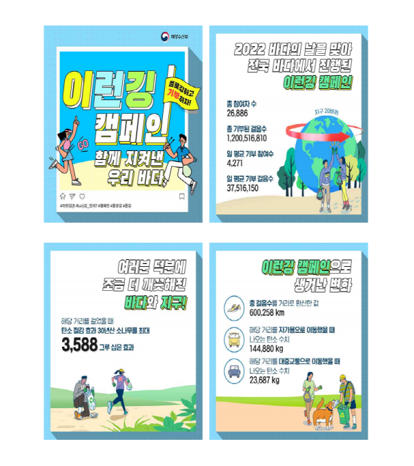 해양수산부는 5월 31일 ‘바다의 날’을 맞아 한 달간 ‘이런(E-Run)깅’ 캠페인을 진행했다. 이런깅은 모바일 앱 ‘빅워크’를 통해 참여자들이 함께 목표 걸음 수를 달성해 기부하는 캠페인으로 진행 기간 내 약 12억 보를 모으며 큰 관심을 얻었다.