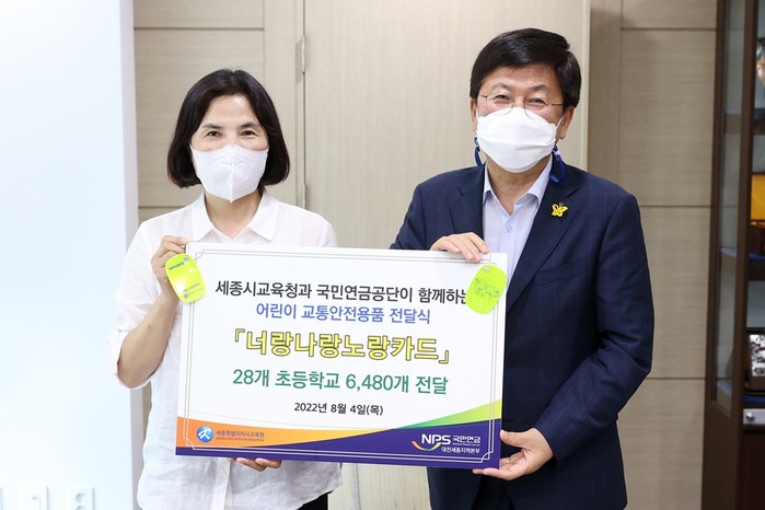 [프레스뉴스] 임규모 기자= 국민연금공단 대전세종지역본부가 4일 세종시교육청에 어린이 교통안전용품 ’너랑나랑노랑카드‘를 전달했다.