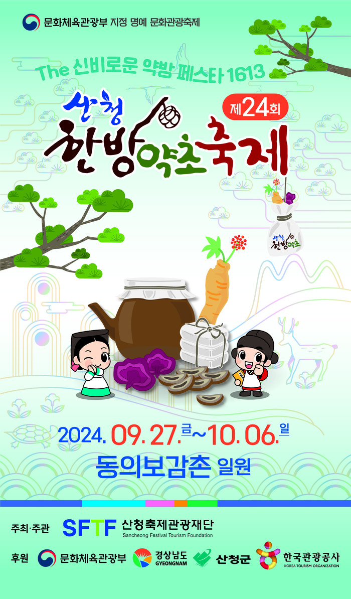 한편, 제24회 산청한방약초축제는 ‘The 신비로운 약방 페스타 1613’이라는 주제로 대중들이 한방을 쉽게 경험하고 자신의 건강을 돌볼 수 있도록 기획되었다. 주제 행사로는 산청혜민서, 내 몸의 보약 체험, 항노화 뷰티관이 있으며, 체험 참여 부스존과 키즈 체험존이 재미를 더한다.