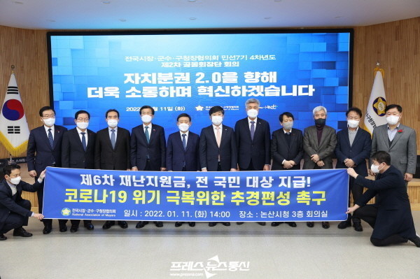 ▲ 11일(화) 오후 논산시청에서 열린 '민선7기 4차년도 제2차 공동회장단회의'에서 공동회장단이 코로나19 위기 극복을 위한 추경 편성을 촉구했다.(사진=전국시장·군수·구청장협의회) |