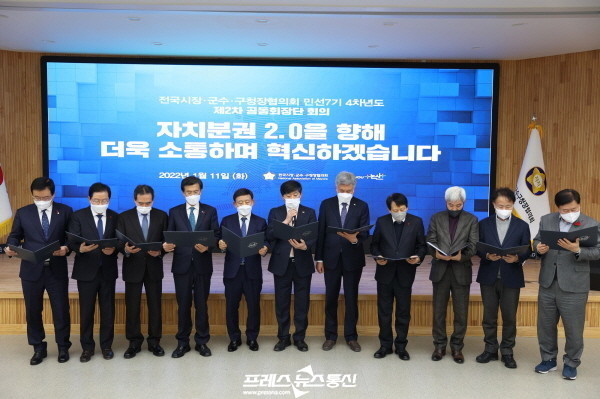 ▲ 11일(화) 오후 논산시청에서 열린 '민선7기 4차년도 제2차 공동회장단회의'에서 공동회장단이 "논산선언"을 낭독하고 있다.(사진=전국시장·군수·구청장협의회) |