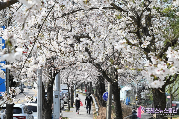 [프레스뉴스] 장현준 기자= 도심 속 거리에, 호숫가 산책길엔 완연한 봄햇살을 머금은 벚꽃잎이 살랑이는 바람 따라 꽃비를 쏟아내고 있다. 흩날리는 꽃잎 사이로 시민들의 마음엔 따스한 봄기운이 스며든다.