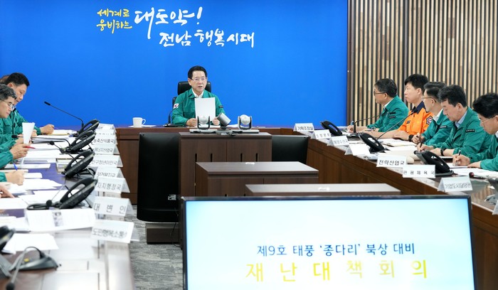 [전남=프레스뉴스] 강래성 기자= 김영록 전라남도지사는 20일 재난종합상황실에서 실국장, 시군 부단체장 등과 함께 제9호태풍 종다리 북상 대비 재난대책회의 북상 대비 재난대책회의를 열어 해수면 상승에 따른 해안가를 비롯한 취약시설 점검 등 선제적 대응을 지시했다.