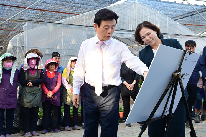 이번 현장점검은 국화작품전시회 작품 준비과정, 국화재배장 재배시설 운영점검, 현업에 종사하는 관계자들에 대한 격려와 당부로 이루어졌다.