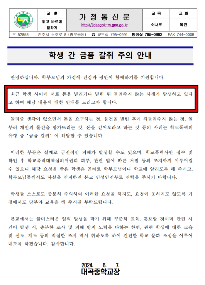 대곡중학교는 지난 6일 ‘학생 간 금품 갈취 주의 안내’ 가정통신문을 발송했다. 가정통신문에는 ‘최근 학생 사이에 서로 돈을 빌리거나 빌린 뒤 돌려주지 않는 사례가 발생하고 있다고 하여 해당 내용에 대한 안내를 드리고자 한다’ 등이 명시되어 있다.