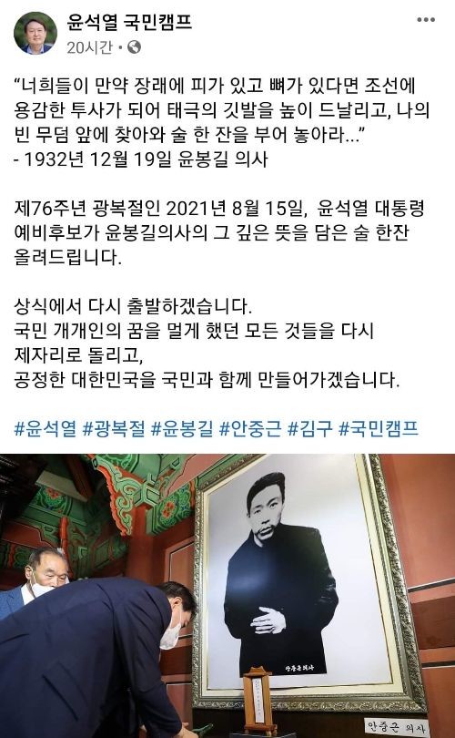 윤 전 총장은 지난 15일 서울 용산구 효창공원에 독립운동가 7인의 영정을 모신 의열사를 찾아 참배했다. 이어 ‘윤석열 국민캠프’ 페이스북에 “너희들이 만약 장래에 피가 있고 뼈가 있다면 조선에 용감한 투사가 되어 태극의 깃발을 높이 드날리고, 나의 빈 무덤 앞에 찾아와 술 한 잔을 부어 놓아라. 1932년 12월19일 윤봉길 의사”라고 적은 글이 올라왔다.