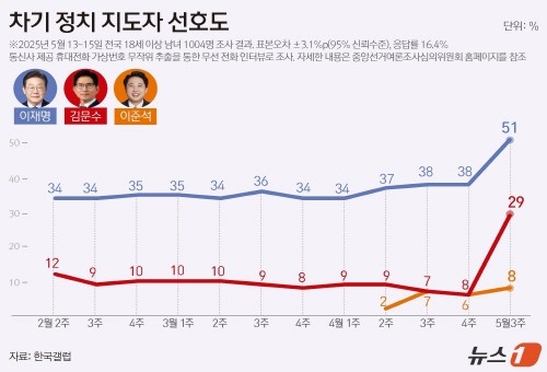 이재명 지지도 '첫 과반' 51%…김문수 29%·이준석 8%