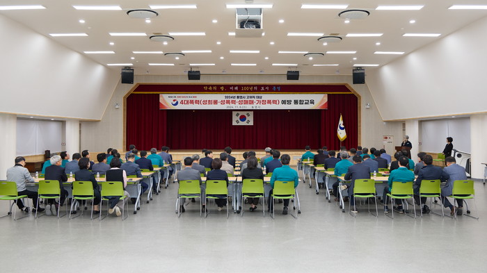 | ▲통영시는 지난 6일 시청 강당에서 5급이상 고위직공무원 60여 명이 참석한 가운데 ‘2024년 고위직 4대폭력(성희롱·성매매·성폭력·가정폭력) 예방교육’을 실시했다 (사진=통영시) |