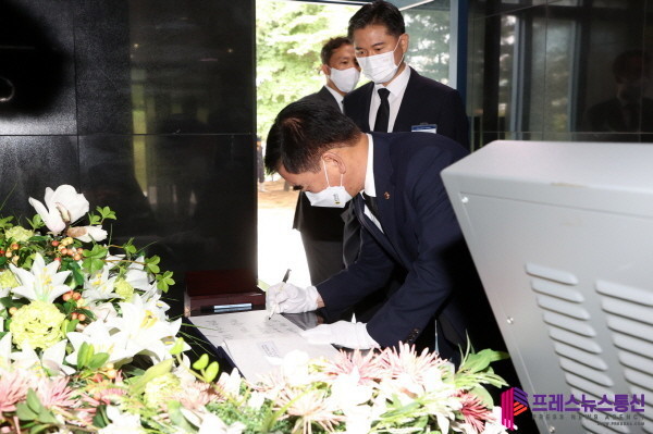 | ▲ 10일 염종현 경기도의회 의장이 수원 현충탑에서 열린 경기도의회 의장 취임 현충탑 참배를 마치고 방명록을 작성하고 있다.(사진=경기도의회) |