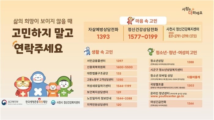 또 ▲사천행복 마음안심버스를 활용한 자살예방 및 생명사랑 홍보관 운영 ▲자살예방의 날 홍보 현수막 게시 ▲관내 마트 카트 지면 광고 등 다양하게 진행한다.