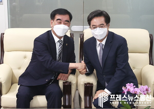 | ▲ 10일 오전 염종현 경기도의회 의장이 김동연 경기도지사를 접견하고 환담을 나누고 있다.(사진=경기도의회) |