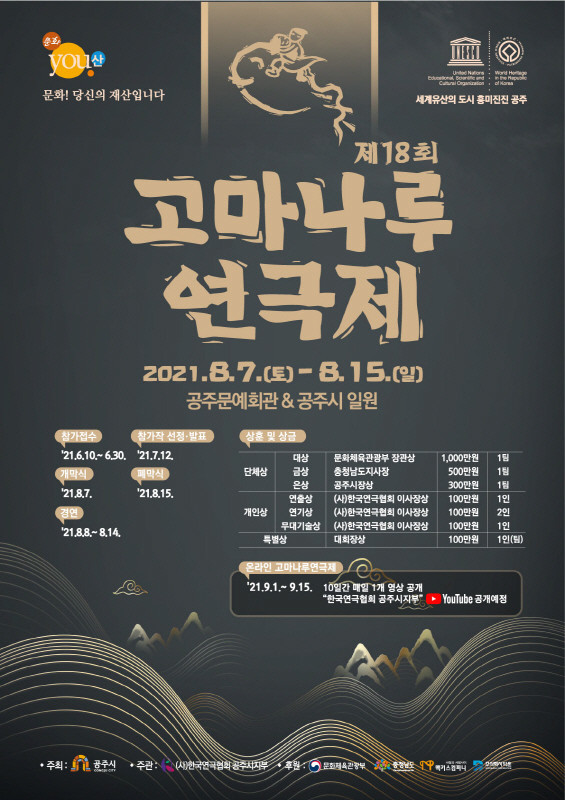대신 ‘온라인 고마나루연극제’라는 형식으로 오는 9월 1일부터 15일까지 경연작과 초청작, 개‧폐막식 영상 등을 한국연극협회 공주시지부 유뷰트 채널을 통해 공개할 예정이다.