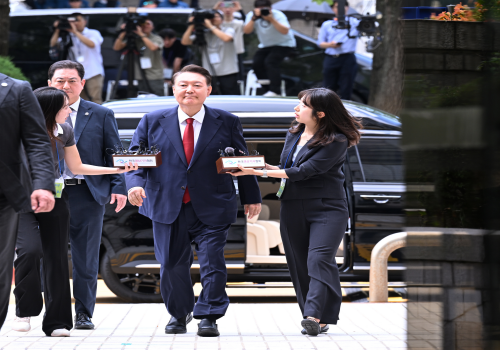 윤 전 대통령은 이날 오후 2시 10분쯤 서울중앙지법 앞에 도착한 차량에서 내려 법원으로 향했다.