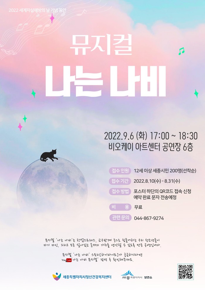 관람신청은 포스터 하단의 QR코드 접속을 통해 신청하며, 비용은 무료이다. 관련문의는 세종시정신건강복지센터로 문의하면 된다.