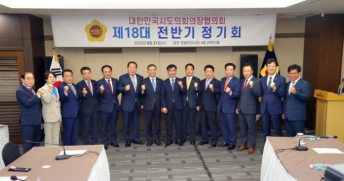 ▲ 대한민국시도의회의장협의회는 21일 대전 호텔인터시티에서 열린 2022년도 정기회를 통해 주요 업무계획 등 현안 보고를 청취하고 제18대 전반기 회장 선출과 추경 예산안 등 안건을 처리했다.(사진=세종시의회) |