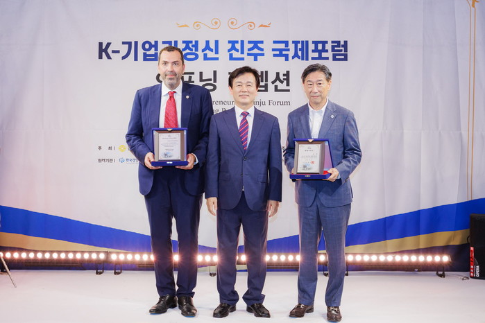 [프레스뉴스] 정재훈 기자= 진주시는 지난 9일 ‘K-기업가정신 진주 국제포럼’ 환영 리셉션에서 아이만 타라비쉬 세계중소기업협의회(ICSB) 회장과 오준 전 유엔경제사회이사회 의장에게 명예시민증을 수여했다.